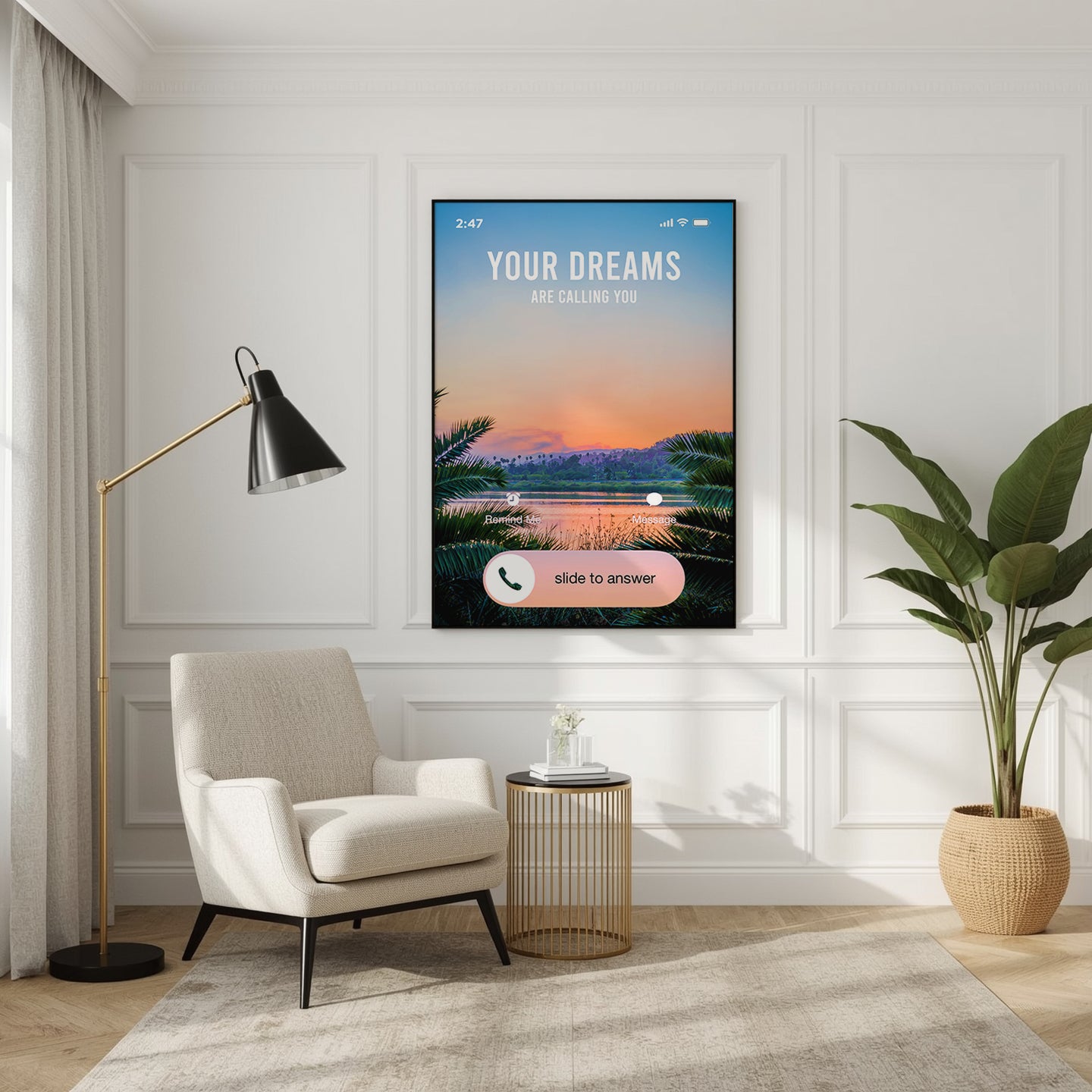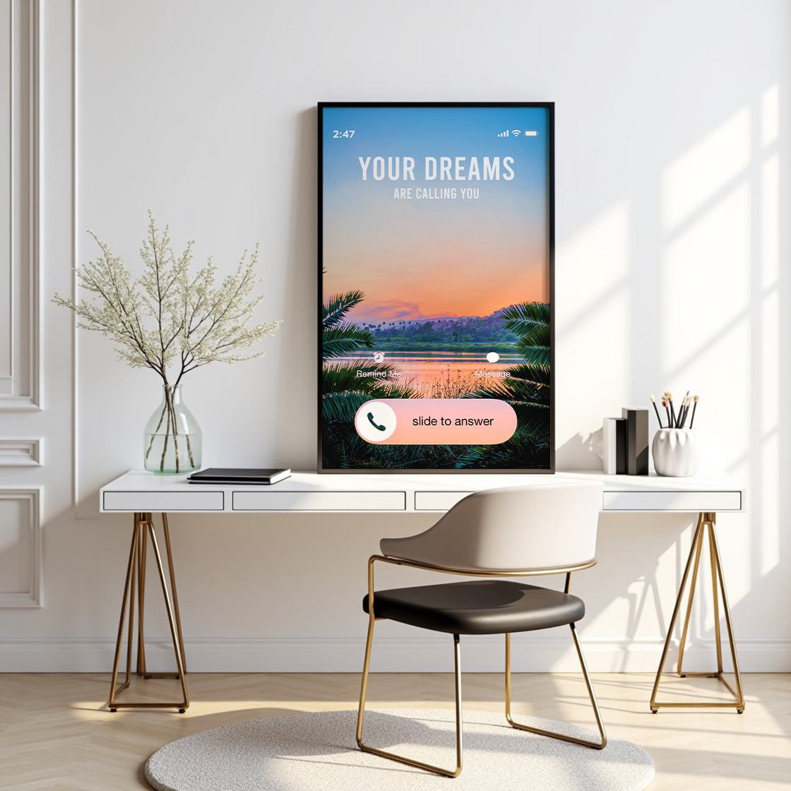 Your dreams are calling—will you answer? This bold and visually striking wall art captures that pivotal moment where ambition meets action. Designed to ignite motivation and remind you of your purpose, this piece is perfect for entrepreneurs, visionaries, and go-getters chasing something bigger. Ideal for home offices, studios, or anywhere that needs a daily push toward greatness.